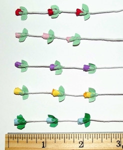 Miniature paper rosebud stems, 7 stems of one color per package, 3 buds per stem for a total of 21 handmade paper rosebuds. Each bud is approximately 1/4". Stem is flexible wire that can be cut. Great to make floral designs on eggs or in cards, pots, urns, or vases.